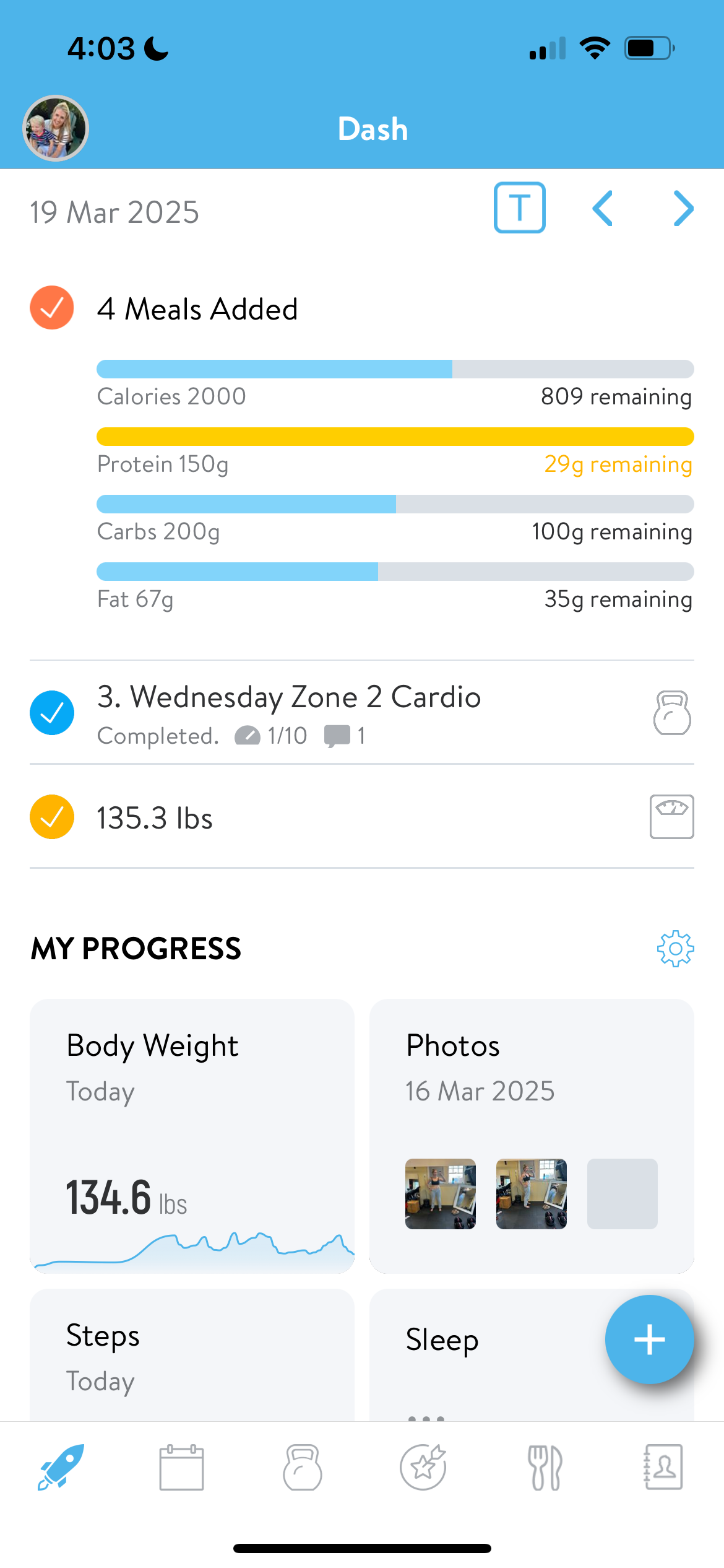 ✅ Progress Tracking – Every workout, weight used, steps, and body metrics in one place